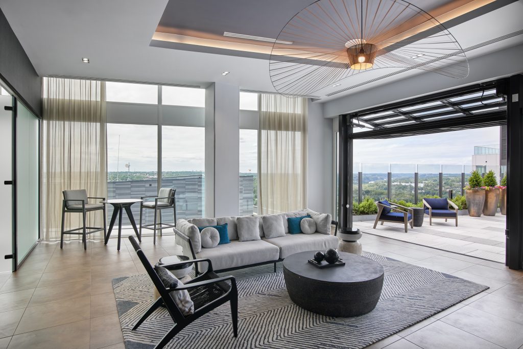 Hospitality also means designing spaces that flex with real life. At Cortland Rosslyn in Arlington, VA, an indoor lounge opens to the pool through a roll-up garage door, creating a three-season entertaining space. Inside, furniture uses outdoor fabric because people often come straight from the pool. Design that anticipates reality feels far more welcoming than design that resists it.