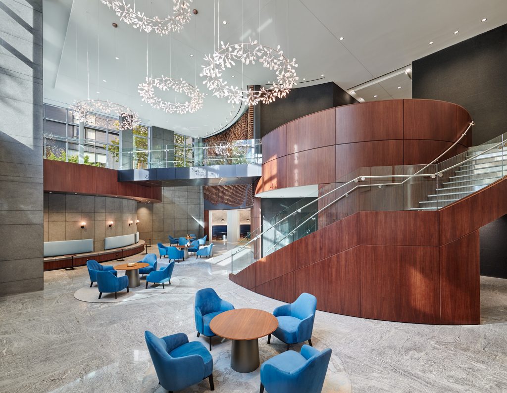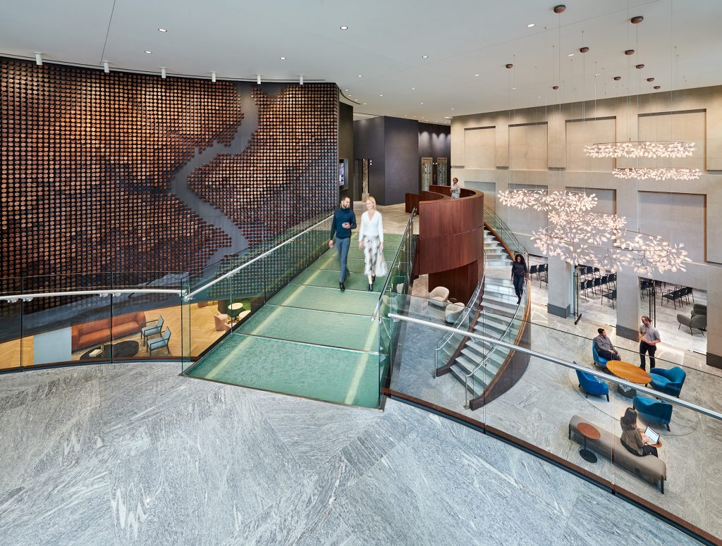A dramatic double-height lobby, overlooking a concourse level amenity center, invites guests across a glass and metal bridge walkway towards a new custom millwork-wrapped reception desk. Remnants of the original design’s predominant use of green glass are concealed by millwork cohesive to the new aesthetic, including the bridge’s underside, visible from the amenity center and wrapped in black metal panels. Throughout, a refined professional palette–which translates to marketing materials–of blue and green tones allude to the original glass color.