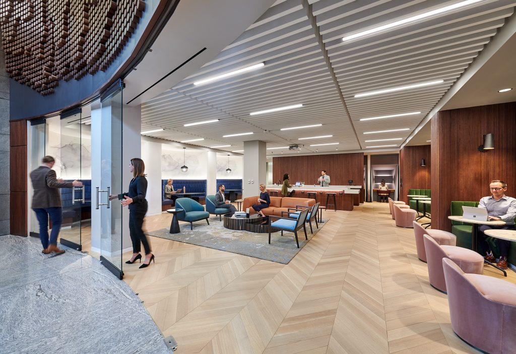 A collaborative tenant lounge offers multiple opportunities to work or socialize with curved, semi-insulated booths, a central café, private wellness and meeting rooms, and phone booths. Brighter colors and abstract smoke wallcovering invite creativity and distinguish it from the natural aesthetic of other amenity spaces. Fabric-wrapped acoustic slatted panels allow the ceiling to remain uncovered for an industrial feel without compromising acoustics. Stone flooring from the lobby transitions to a warmer chevron-patterned wood flooring that reappears throughout.