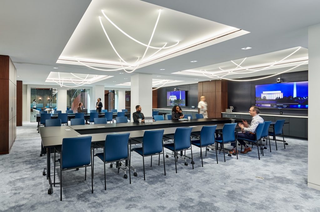 Opposite the tenant lounge, a state-of-the-art, 185-guest conference center features flexible partitions, allowing for multiple meetings to take place at once. Dynamic rope-like lighting fixtures drape the conference ceiling and underscore its depth. Small to mid-size rooms surround the main conference center to support additional meetings.