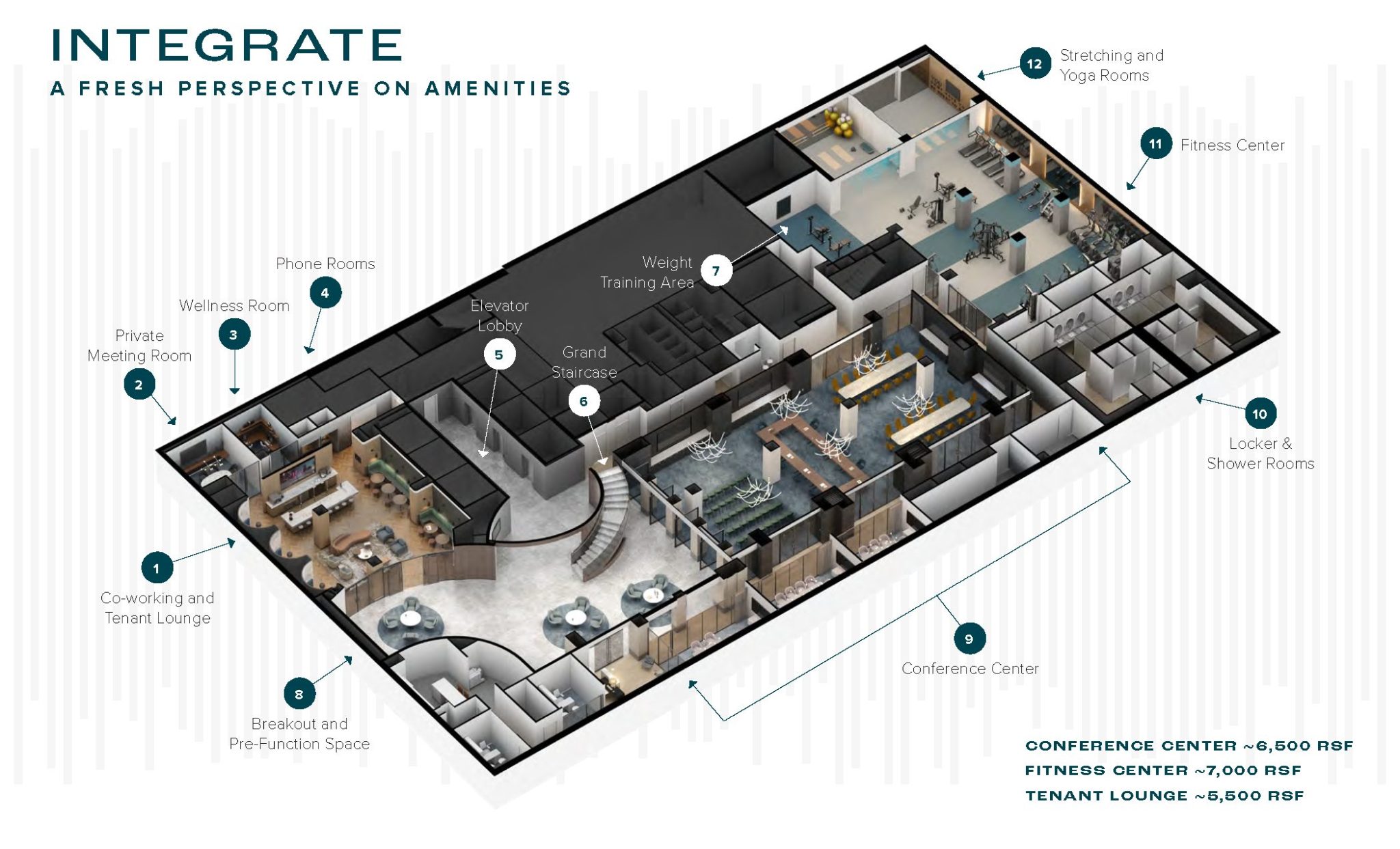 Down the hall, a new fitness facility features luxury equipment and studios for private sessions while a ride-in bike room offers commuters lockers, showers, towel service, and maintenance stations. Wallcoverings in both secondary meeting rooms and the fitness center subtly depict abstract wilderness scenes.