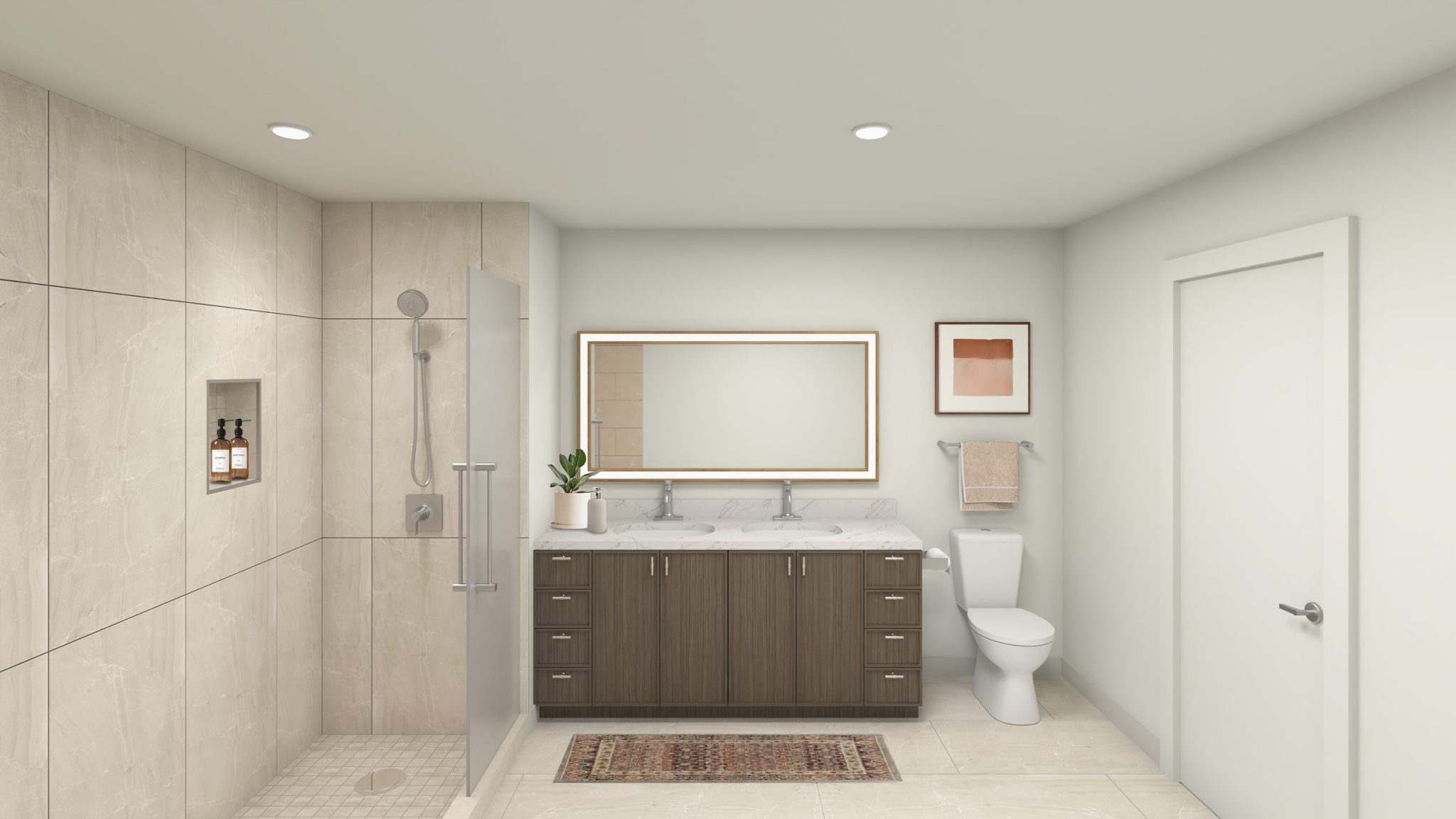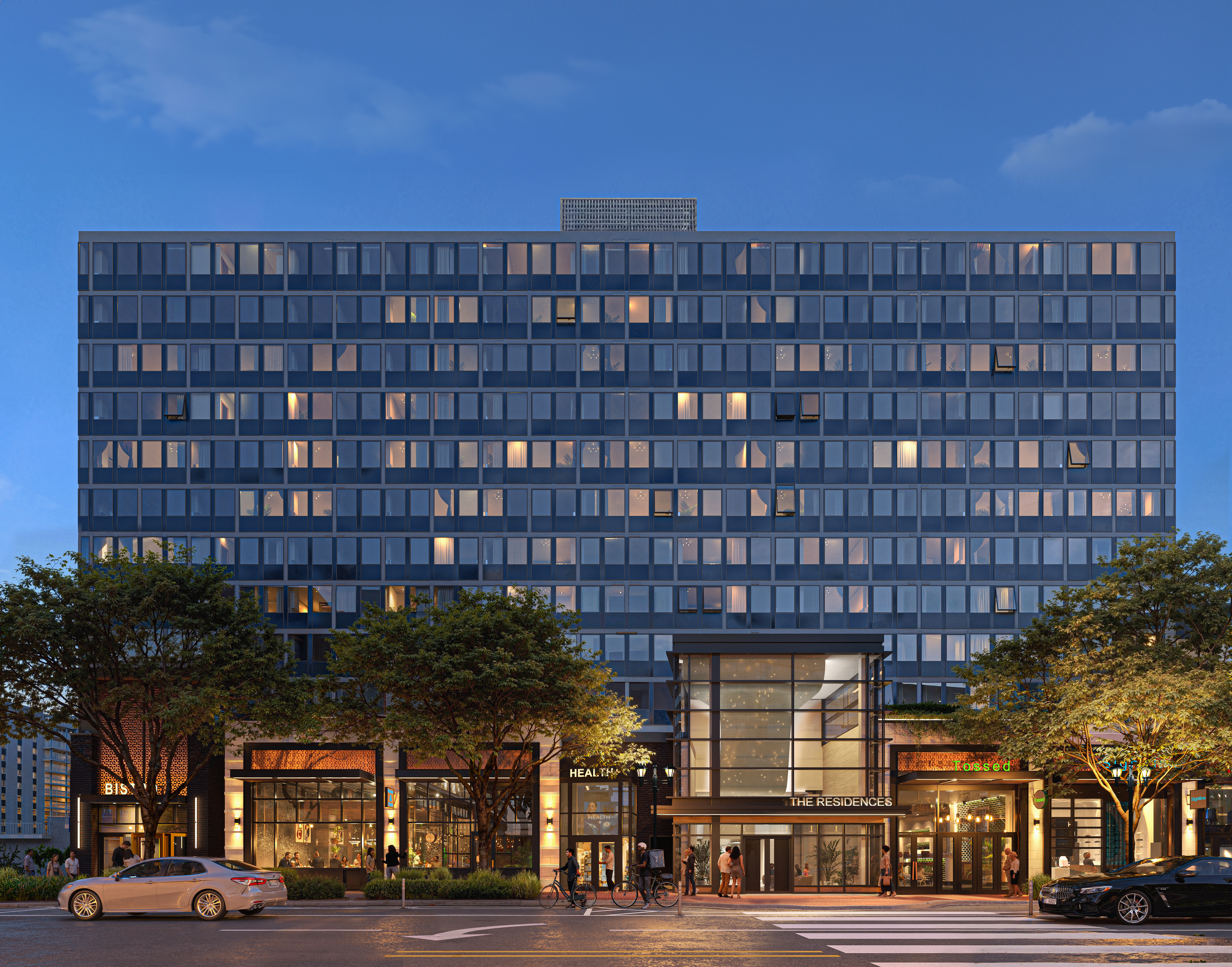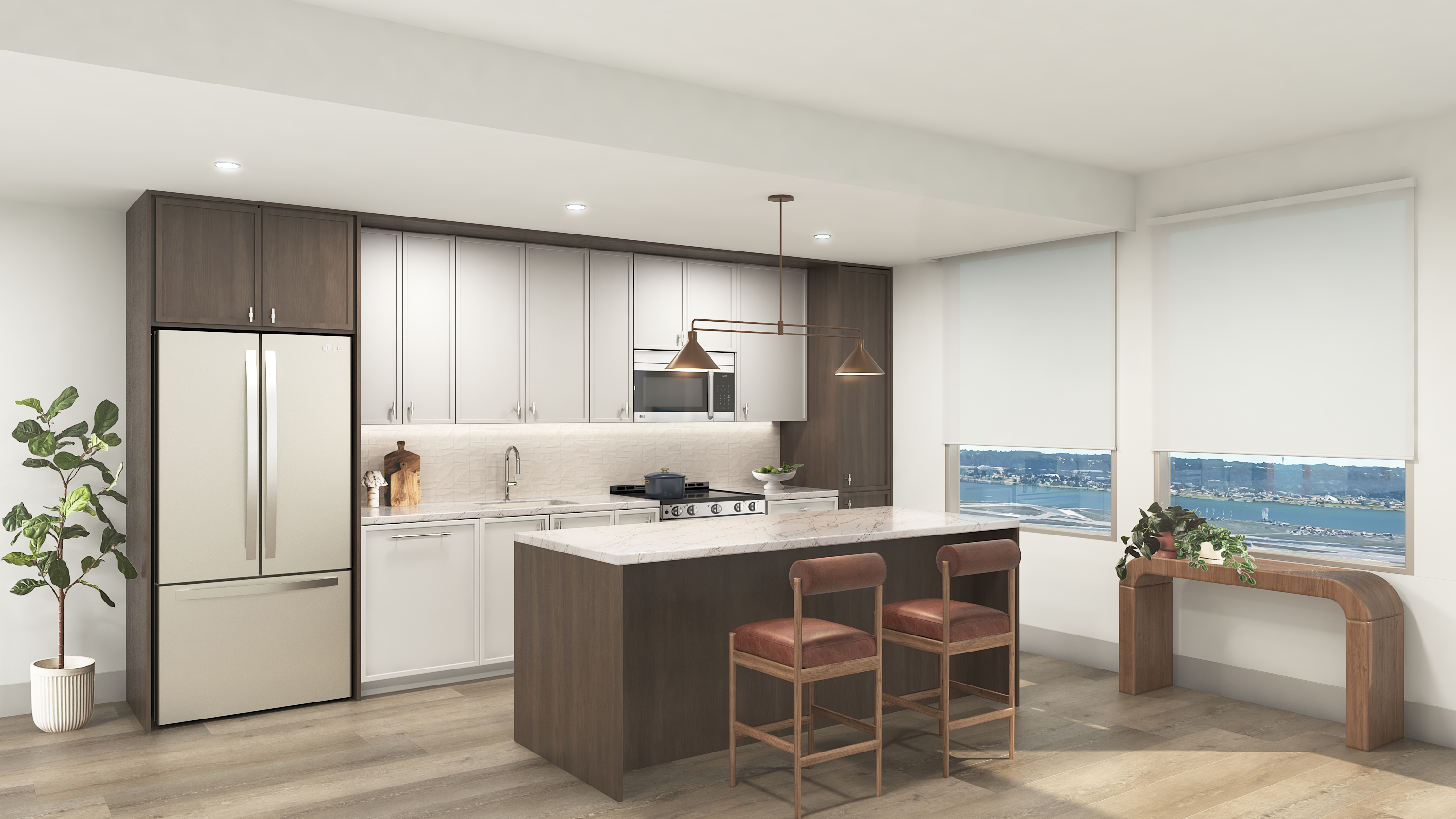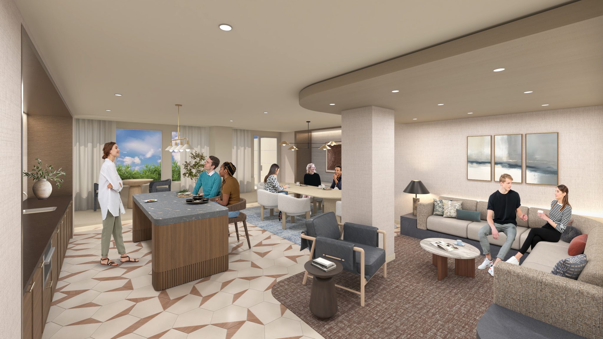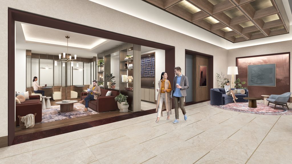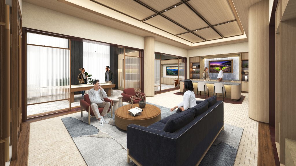 The amenity program supports a variety of different lifestyles, offering spaces that encourage everything from movement and play to relaxation and socialization. Residents enjoy a double-height, state-of-the-art fitness center with premier equipment, a dedicated kids’ playroom, a sports simulator, a pet spa, and numerous coworking spaces. An expansive clubroom and terrace lounge anchor the amenity program, providing spaces for gathering, hosting, and unwinding, rounding out a community experience that blends sophistication with ease.