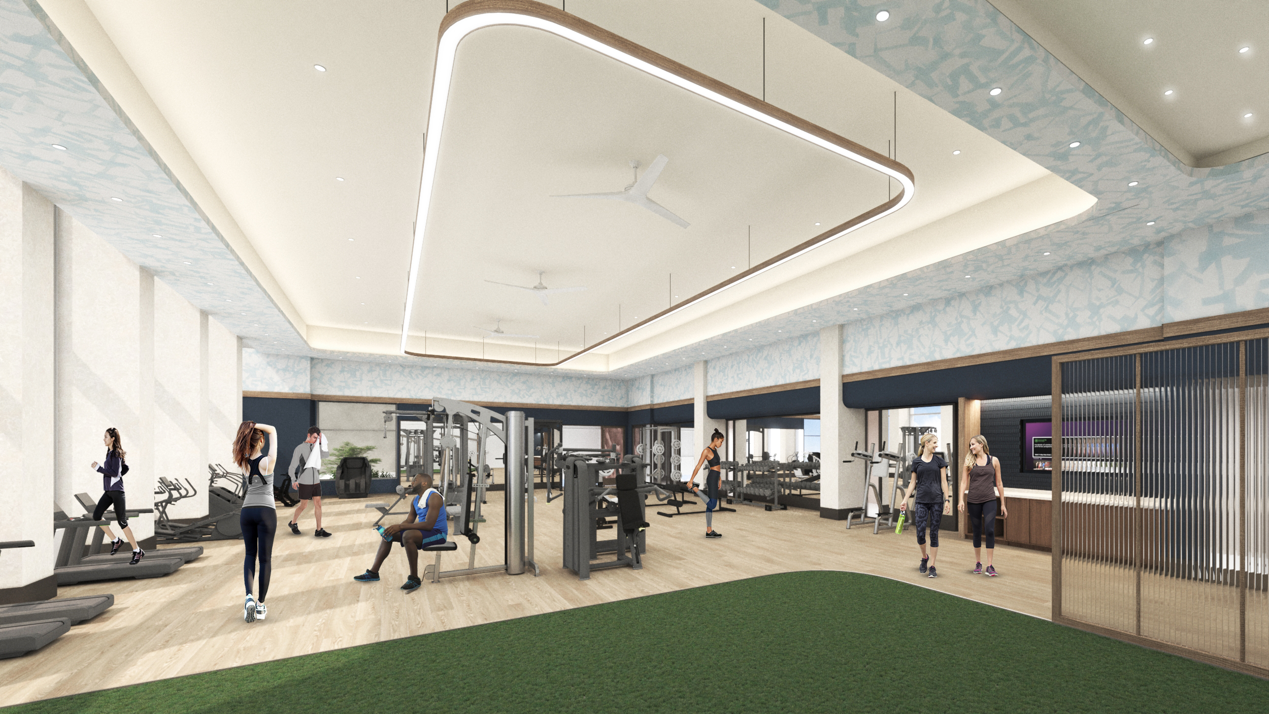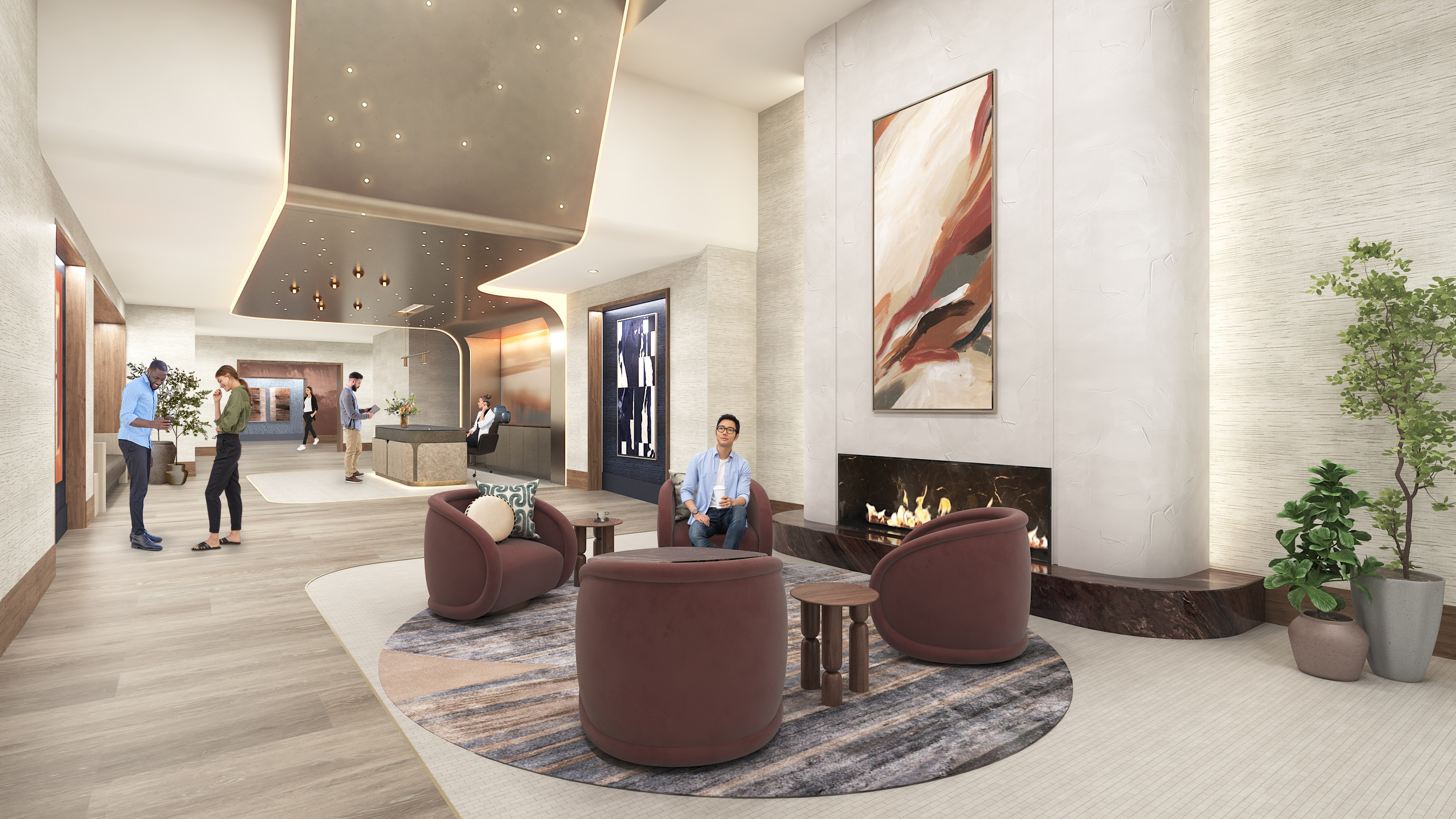 The former Shops at Crystal City Underground are transformed into a dynamic entry experience. The entryway is a long corridor characterized by a “ribbon” ceiling feature, soon to host 1,000 fiber optic lights, that intuitively guides guests and visitors from the outside to the concierge. Along the way, the “ribbon” ties into an existing skylight, allowing a moment of pause for people to admire the open space and accompanying fireplace. Beyond this design feature, the interior design continues the theme of openness and comfort, aligning with the building’s focus on high-quality, larger units intended to appeal to young families and discerning renters wanting practical, elevated, and comfortable spaces.