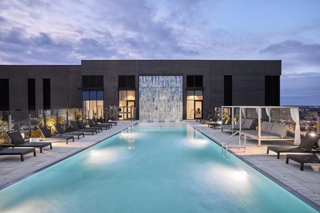 Residents have access to over 20,000 SF of public amenity spaces, including The Porch, its crown jewel indoor-outdoor penthouse lounge. A 65-foot-long rooftop infinity pool with a custom-mosaic-tiled waterfall feature wall overlooks some of the region’s most beautiful sights. Shared with Pierce residents, The Porch also offers an outdoor entertainment kitchen, fire pits, and cabanas, creating a private resort-like escape in the center of Arlington. Inside, the Tailgate Lounge features several booths and plasma-screen TVs for socializing on game day.