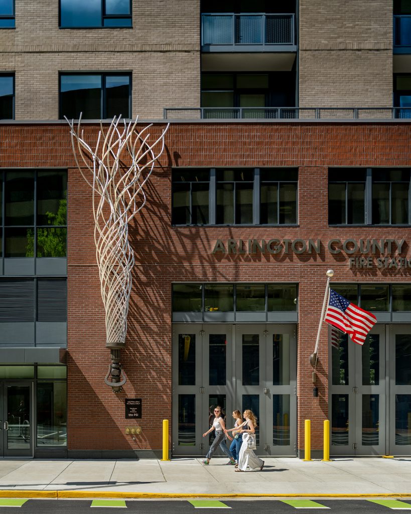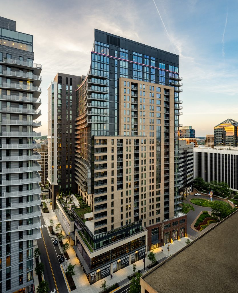 Residences are situated atop 20,000-SF of retail space and a 16,988-SF community fire station. On the building’s west façade, a 500-foot radius curves away from the property line to preserve the pedestrian experience and meet Arlington zoning requirements. The curve is offset twice towards the eastern façade both horizontally and vertically throughout the building.