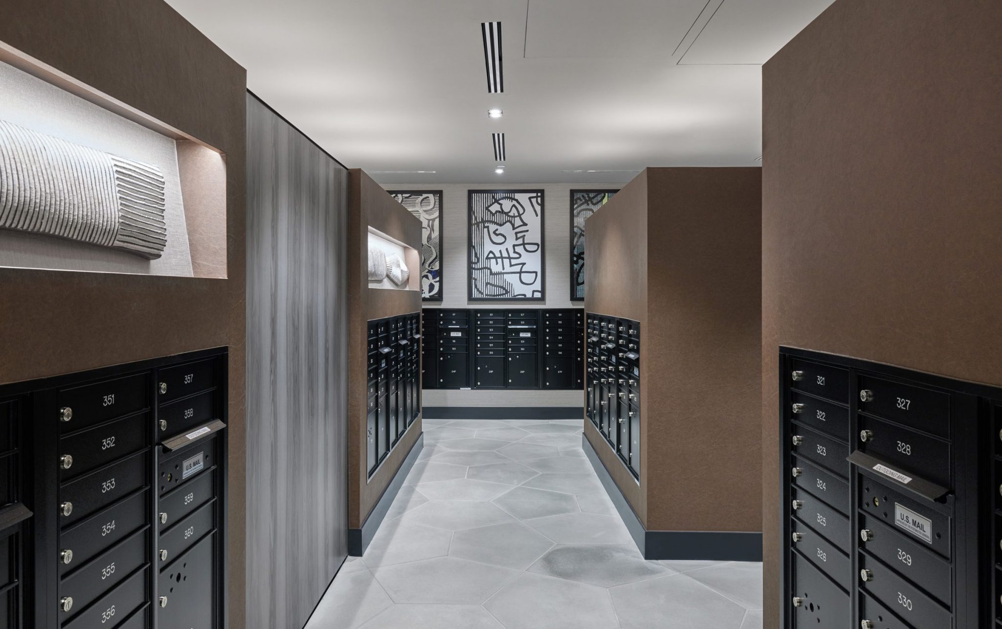 An inviting lobby featuring hospitality-infused details and a blend of organic and sleek finishes provide an immediate introduction to the community’s approachable yet luxurious character. Throughout the public spaces, subtle plaid patterned and leather furniture, smokey geometric wallpaper, and vintage brass tones combine for an elevated collegiate-inspired environment.