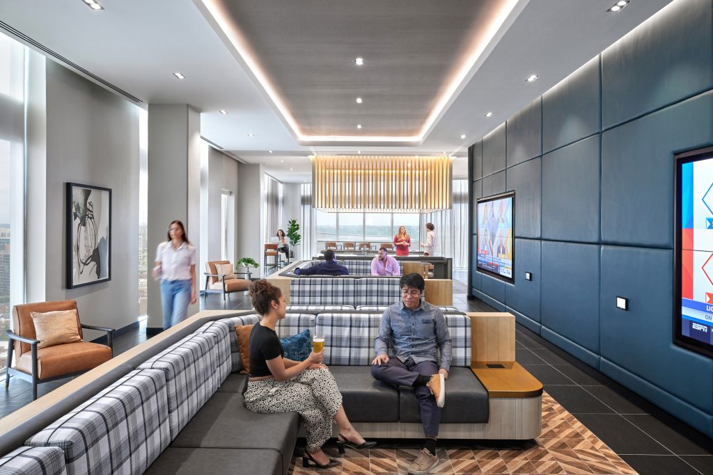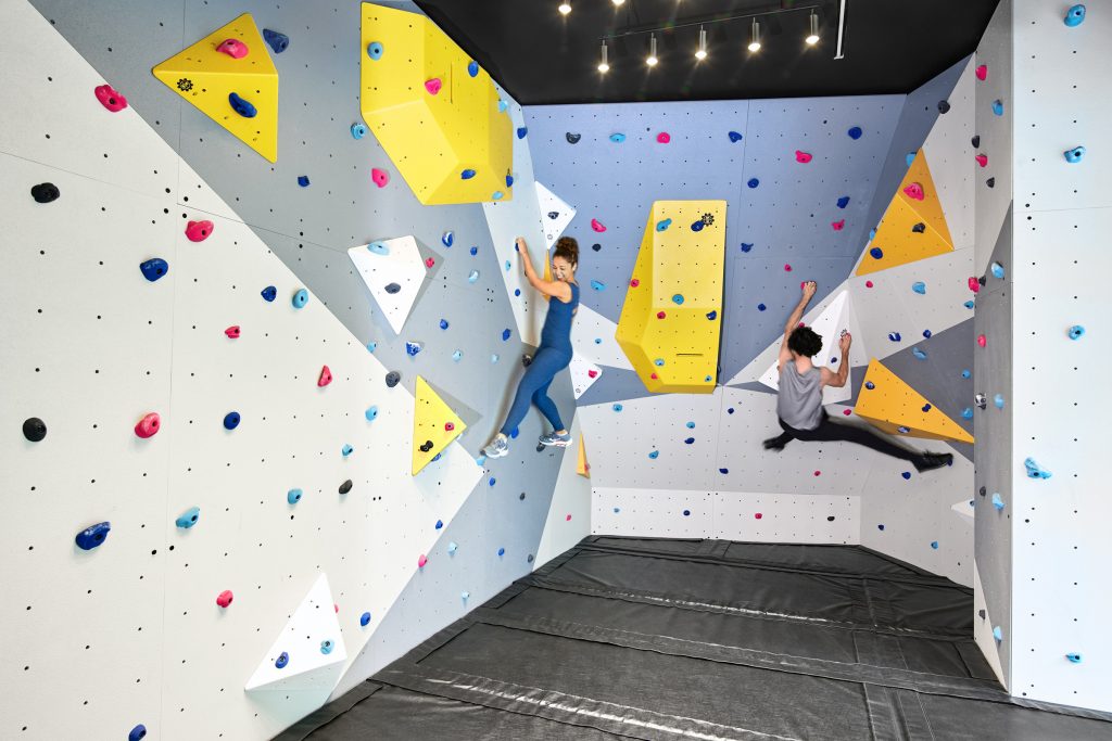 On the second floor, a fitness facility overlooks the streetscape, offering rock climbing, boutique group classes, and access to a private Aqua Spa. Co-working lounges and small meeting rooms throughout the building accommodate today’s hybrid worker and entrepreneur. Designed for a diverse community of families and young professionals, additional amenities include a tree house-inspired playroom for children and a game room complete with a golf simulator, dart boards, and beer on tap.