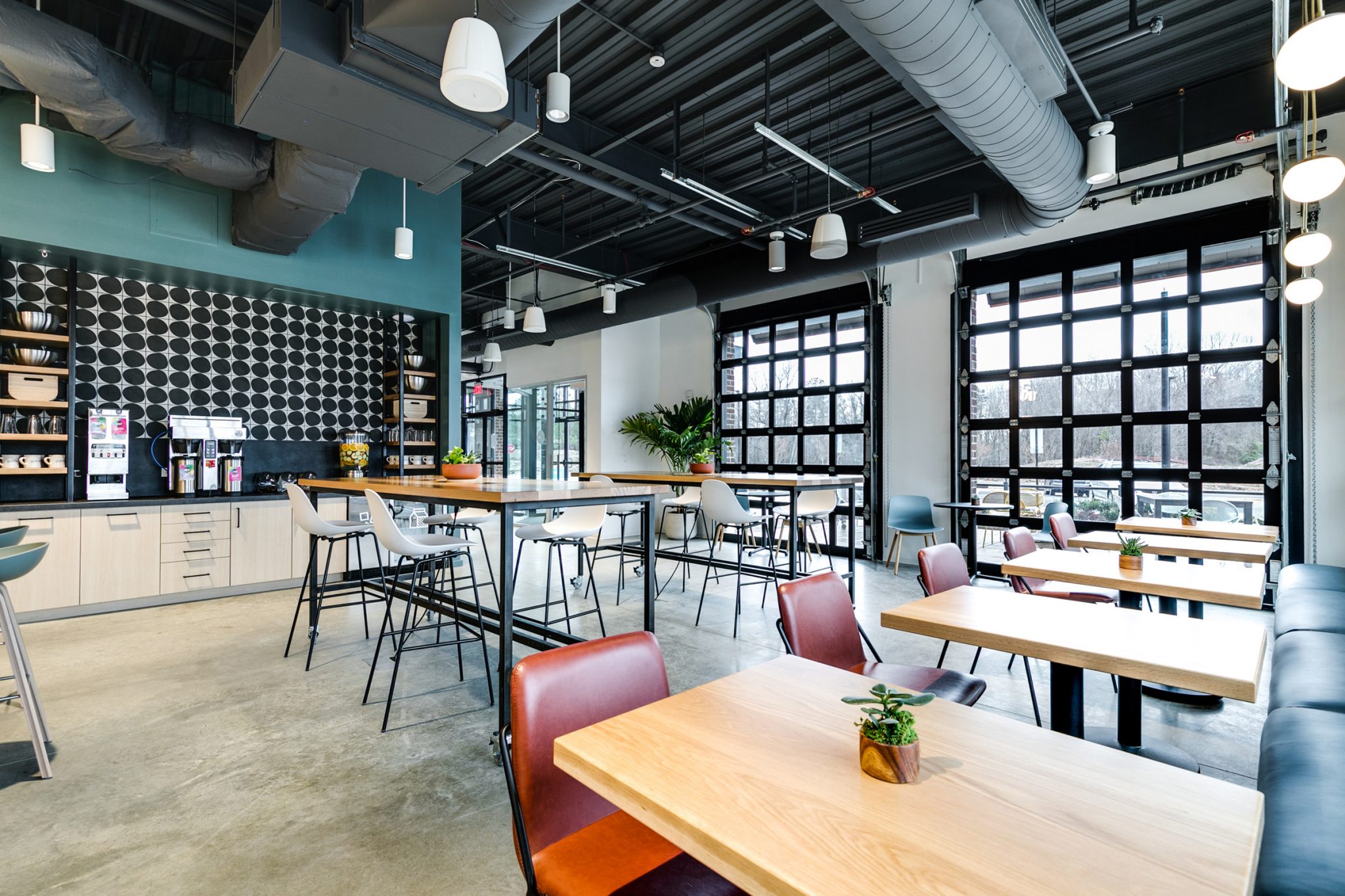 Seeking to bring the outdoors in, custom garage doors open onto an outdoor patio with park views while southern-facing desks overlook forest for a connection to nature. Soothing wellness rooms offer respite to employees or privacy to new mothers.