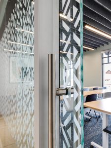 Named after gemstones, the conference rooms feature custom wall graphics like macro photographs of stones, shimmering geometric wallpaper, and abstract jewel paintings by a local artist.