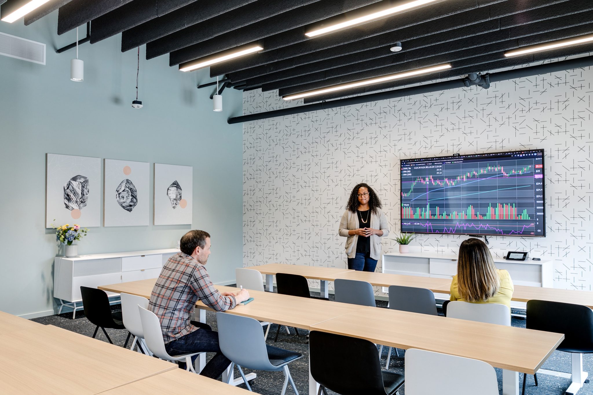 Flexible workstations include a café and bar, train-inspired banquettes, private phone booths, and independent reading nooks. Several large conference rooms are fully integrated with seamless plug-and-play technology.