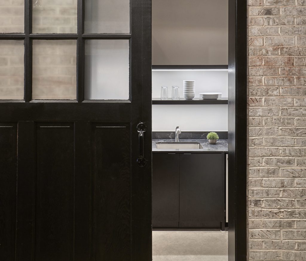 The updated boutique studio incorporates elements of the original warehouse including the use of the historic entrance façade as a striking divide between the front and back sections. Much of the original brick remains, hand-painted a subtle crème color to elevate the space and play off the soft airiness and sunlight provided by the center skylight. Ceiling trusses connect to form a delicate butterfly pattern reminiscent of the original infrastructure and provide contrast to the industrial style ceiling pipes.