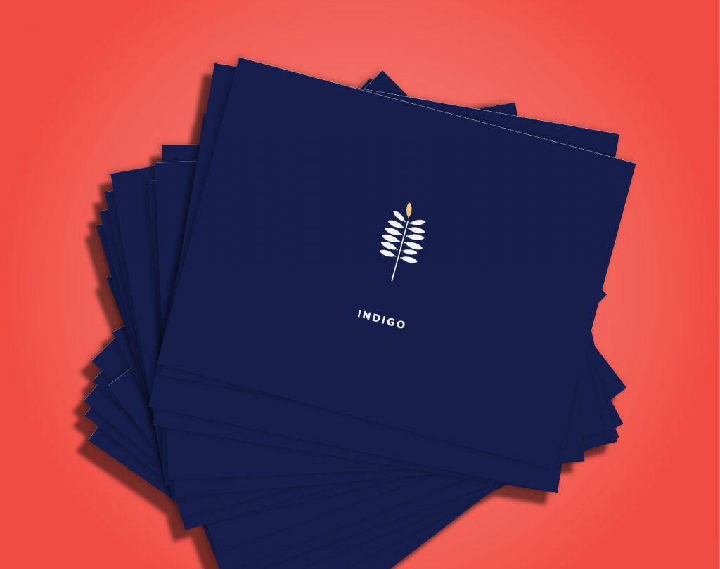 Hickok Cole Creative delivered a brand identity package to Indigo Asset Services that included strategy, art direction, copywriting, and design and production. The identity package is a study in subtle but careful detail of engraving, gold and white foil, and duplexed paper in the perfect indigo blue.