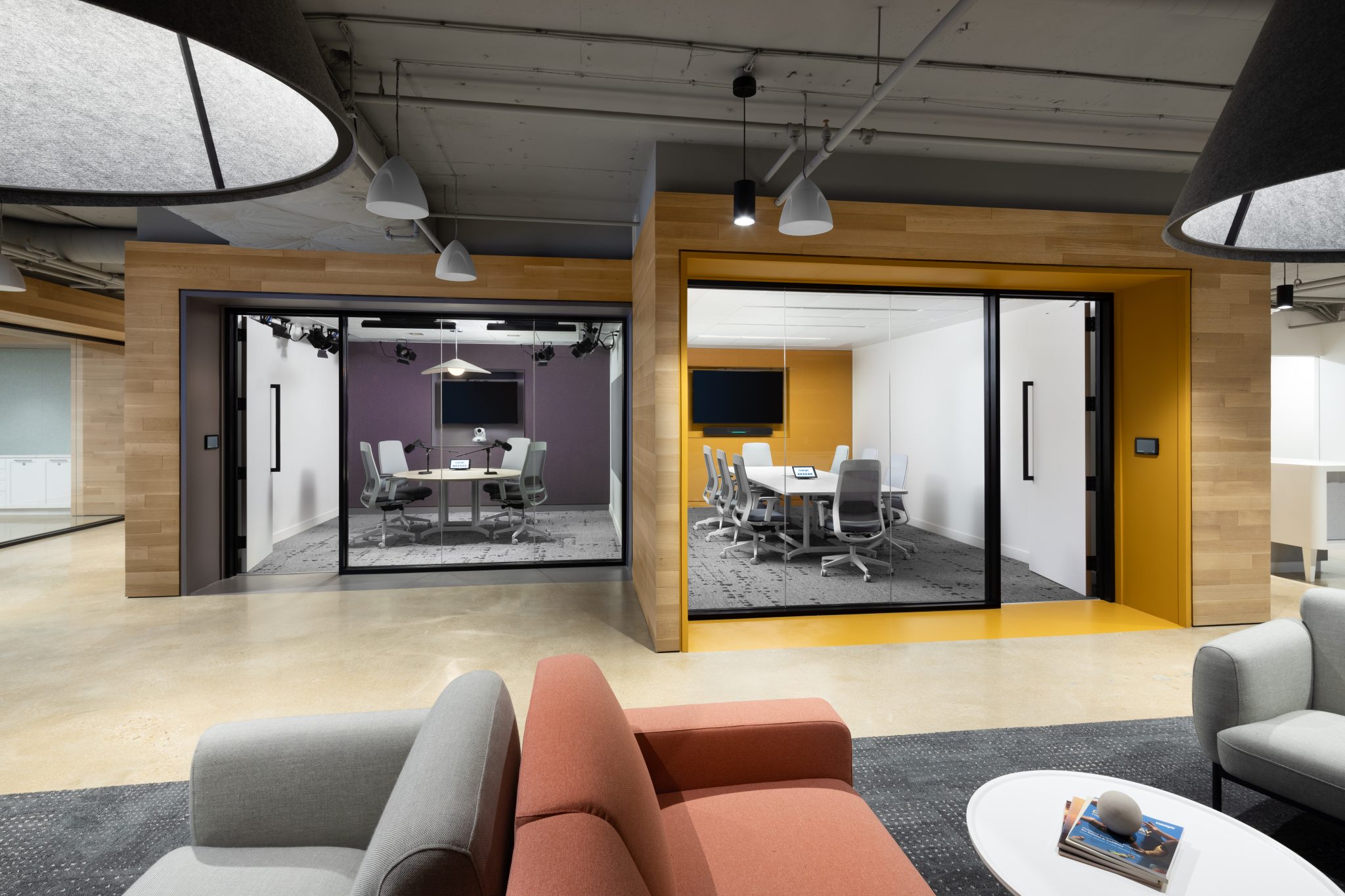 Sophisticated design interpretations of early-stage educational tools and unexpected pops of color add whimsy to NAEYC’s new home. The incorporation of desaturated primary colors for accent walls and furniture differentiates neighborhoods and departments in a playful yet professional way. Custom wood panels wrap the meeting rooms and café, creating a connection to learning blocks.