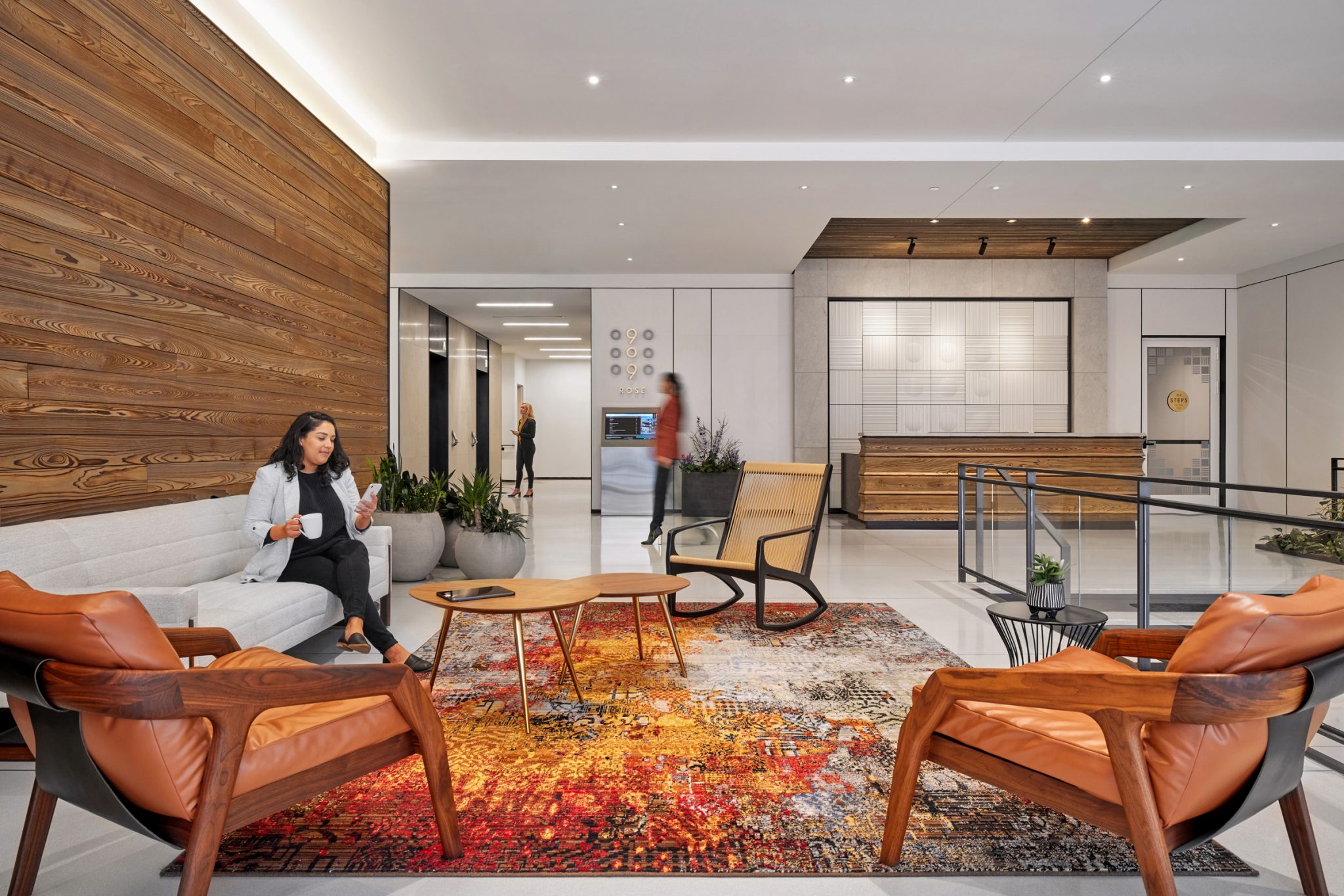 A heavy emphasis on place-making at the lower levels grounds the structure in the context of its up-and-coming neighborhood. Set back from the intersection of Rose Avenue and Trade Street, the building entry provides a lush public plaza with outdoor restaurant seating and leading tenants and visitors into the sleek lobby space.