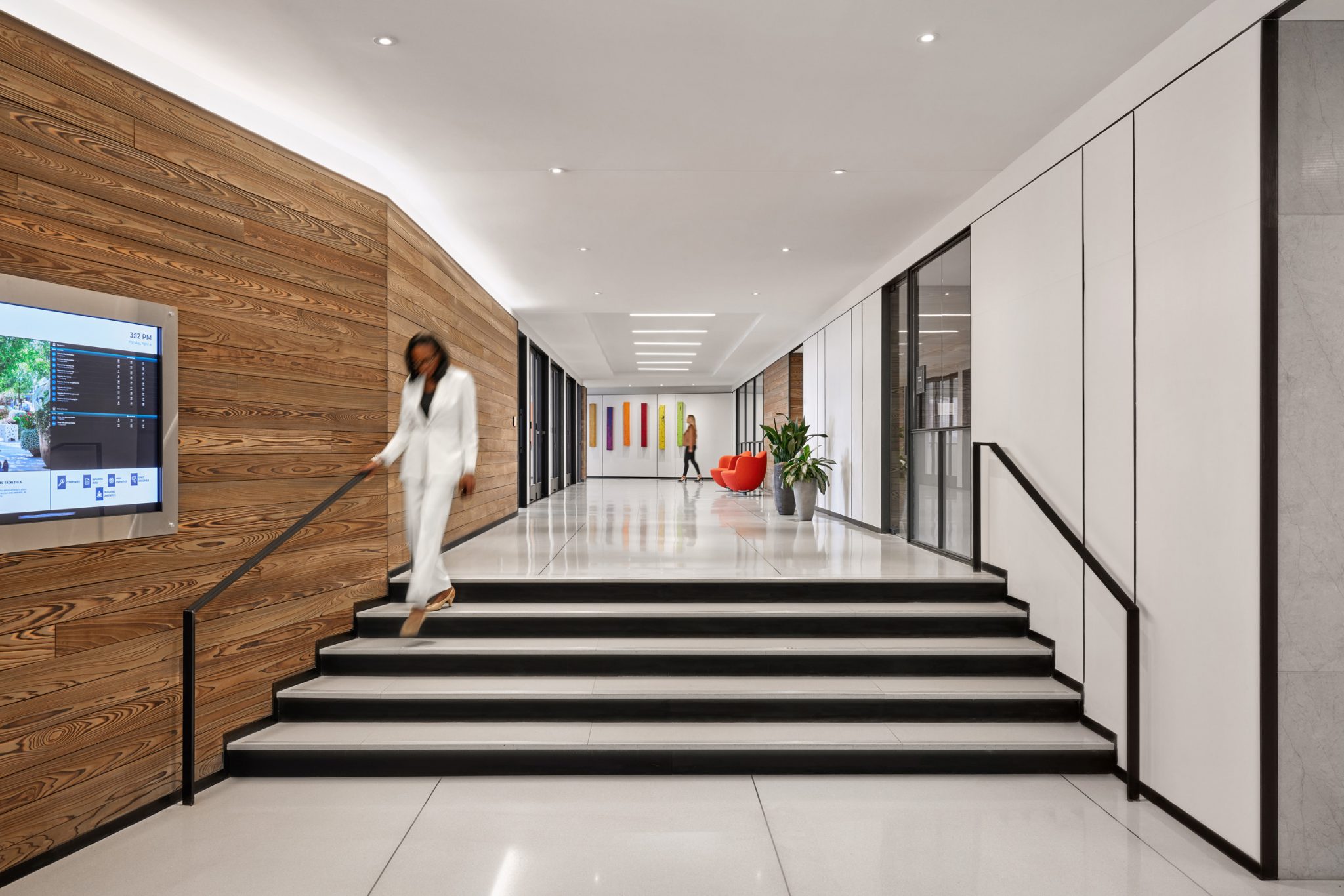 A glass curtain wall and fluted, glazed architectural terracotta panels embedded in precast concrete make up the building’s striking facade. Expansive openings, combined with a shallow core depth, contribute to optimized natural light penetration and provide access to exterior views.