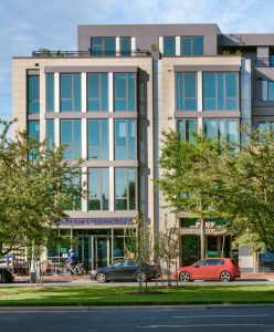 Stepping back the facade presented a unique opportunity to incorporate several terrace levels, resulting in private outdoor spaces in 75% of units. Floor-to-ceiling windows throughout provide ample natural light and a shared rooftop terrace designed for entertaining — and lasting impressions — features seasonable planters,  grilling areas, and views of the surrounding monuments.