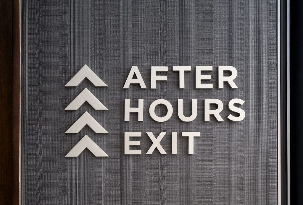 Inside the building, a complementary wayfinding system extends this design language. Clean, dimensional lettering is finished to match the metal tones used throughout the space, establishing continuity with the monument sign and surrounding interiors. Typography follows the brand font, while directional arrows mirror the corner notches found in the logo for a unified visual rhythm. The result is a simple, clean, and sophisticated solution that guides movement while reinforcing the project’s overall identity. Together, these elements create a seamless transition from exterior to interior, reflecting the craftsmanship and atmosphere that define the experience.