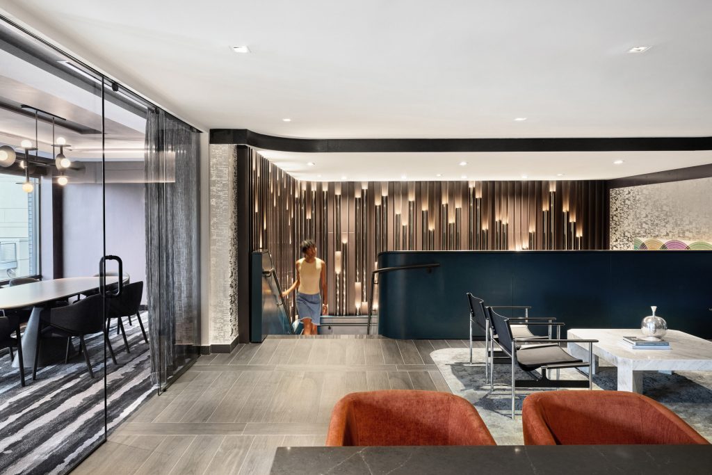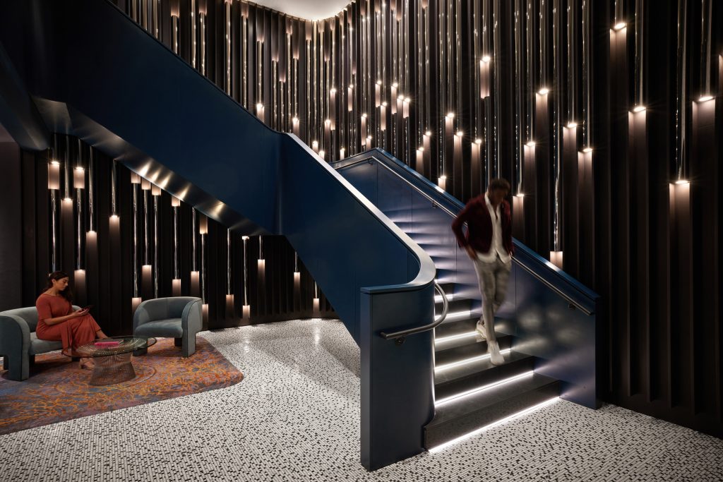 A grand staircase—lined with organ-inspired chrome pipes designed to replicate sound waves—leads you into a leasing area on the second floor, where current and future residents are met with unparalleled service. The moody instrument reflects the interior design of Reverb, further reinforcing its connection to the neighborhood.