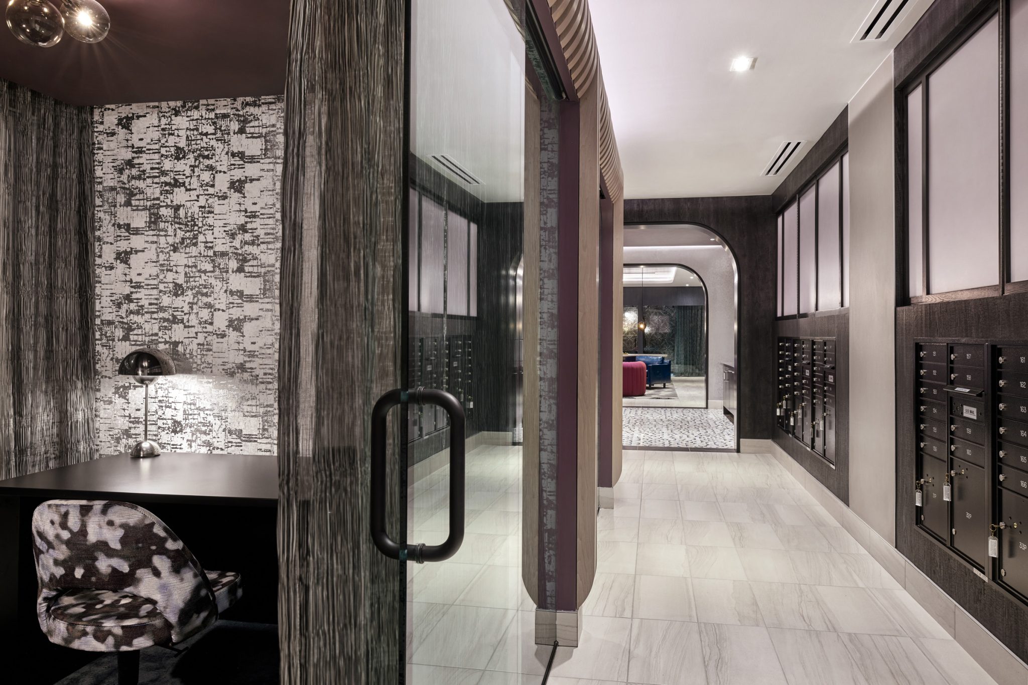 From the lobby to the penthouse, curated art and custom lighting and furniture are located throughout the building. The millwork and lighting in the mailroom nod to the organic forms throughout the interior architecture of Reverb—and provide a preview of the light and airy apartment units—while also balancing the dark composition of most of the interior space. Coworking stations are located throughout the ground floor, in addition to the mailroom, in response to the post-pandemic demand for these spaces. To appeal to young professionals, providing a comfortable space to work from home was a top priority.