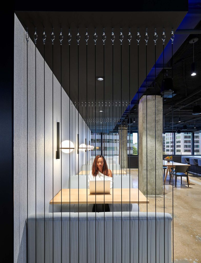 Innovative design details, such as screening elements with [sweatlana] cabling at the entrance and between booths in the café, evoke a sense of intrigue and subtle branding throughout the space.