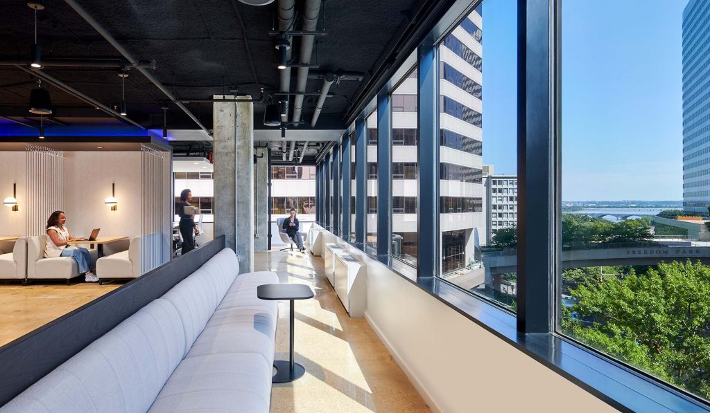 A rejuvenation lounge adjacent to the café provides a connection to nature with views of the Theodore Roosevelt Bridge and Freedom Park, allowing employees to watch planes take off and land at Reagan National Airport.