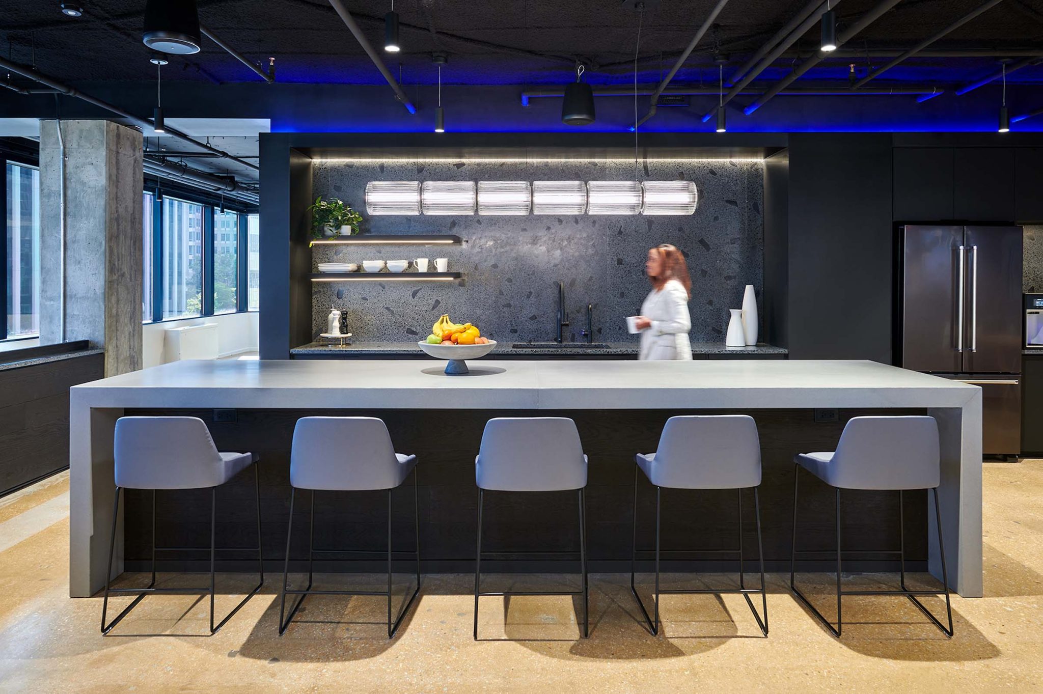 The core of the space meets the needs of the employee community by offering a diversity of workspaces as well as a café, promoting active design through destination nodes for collaboration, all-staff meetings, nourishment, and respite.