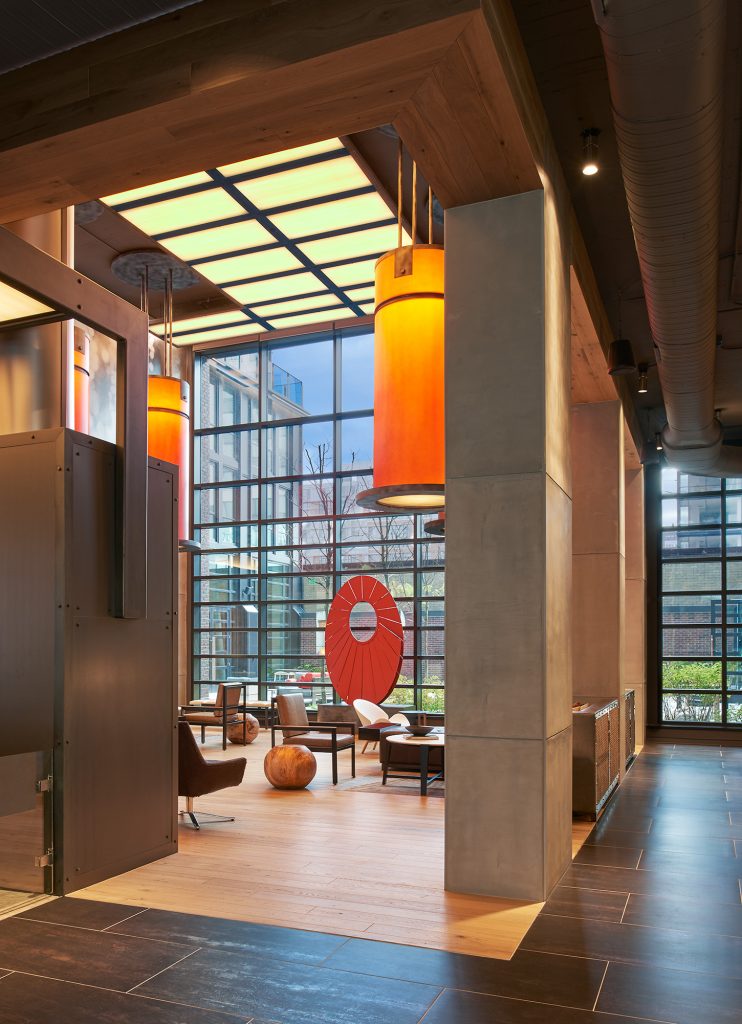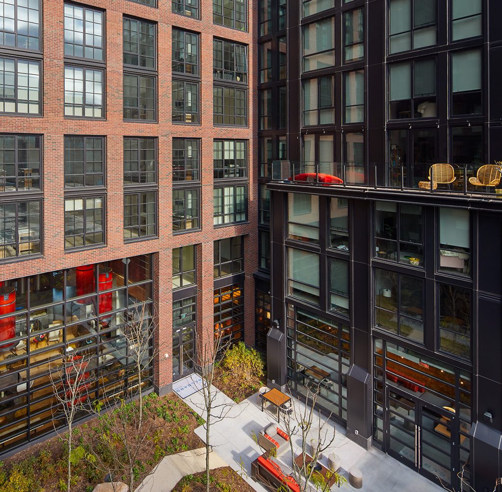 A mid-block building, The Belgard maximizes density and rentable square footage, incorporating two-story lofts encased in a glass jewel box as well as some of the city’s first micro-units. Two black metal and glass forms, nicknamed the wings, extend from the core frame of the building and house the smaller units, giving them a unique identity while simultaneously creating the opportunity for three ground-level courtyard spaces.