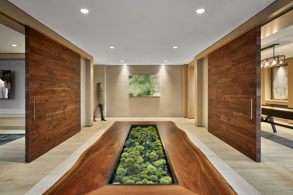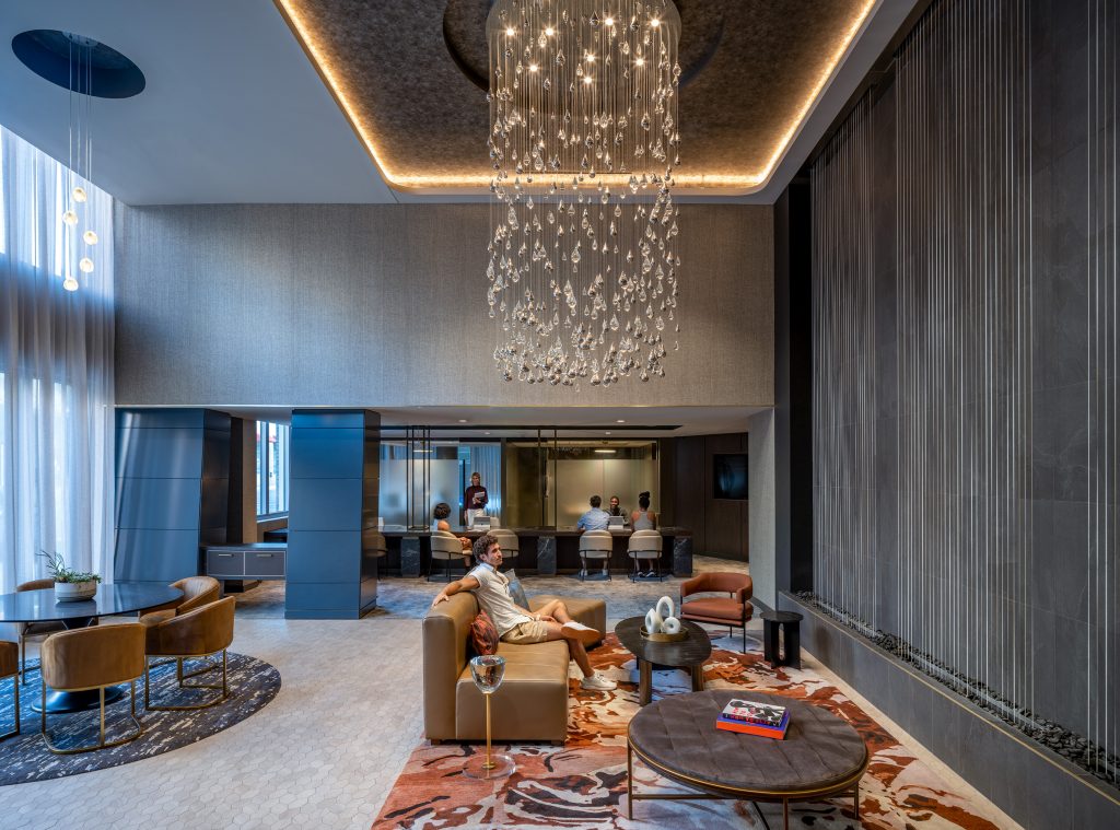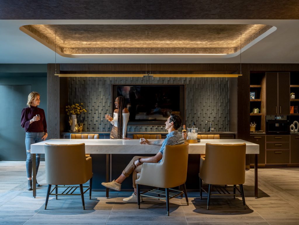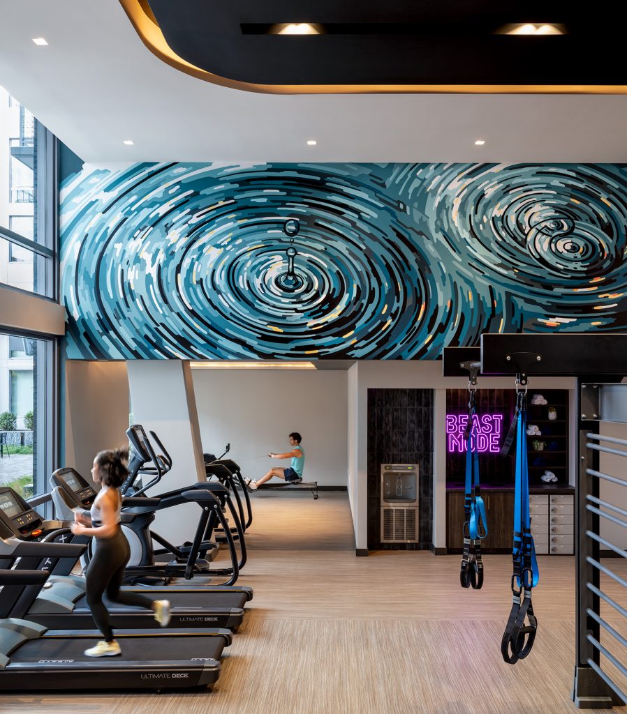 A big challenge was identifying the ideal amenity programming for each space plan and design concept. The resulting design establishes Rain for a younger demographic, incorporating social and entertainment-related amenities. Silver finishes bring the Rain concept to life in the lobby’s custom-designed crystal raindrop chandelier and double-height rainscreen, as well as the fitness center’s custom water droplet mural.