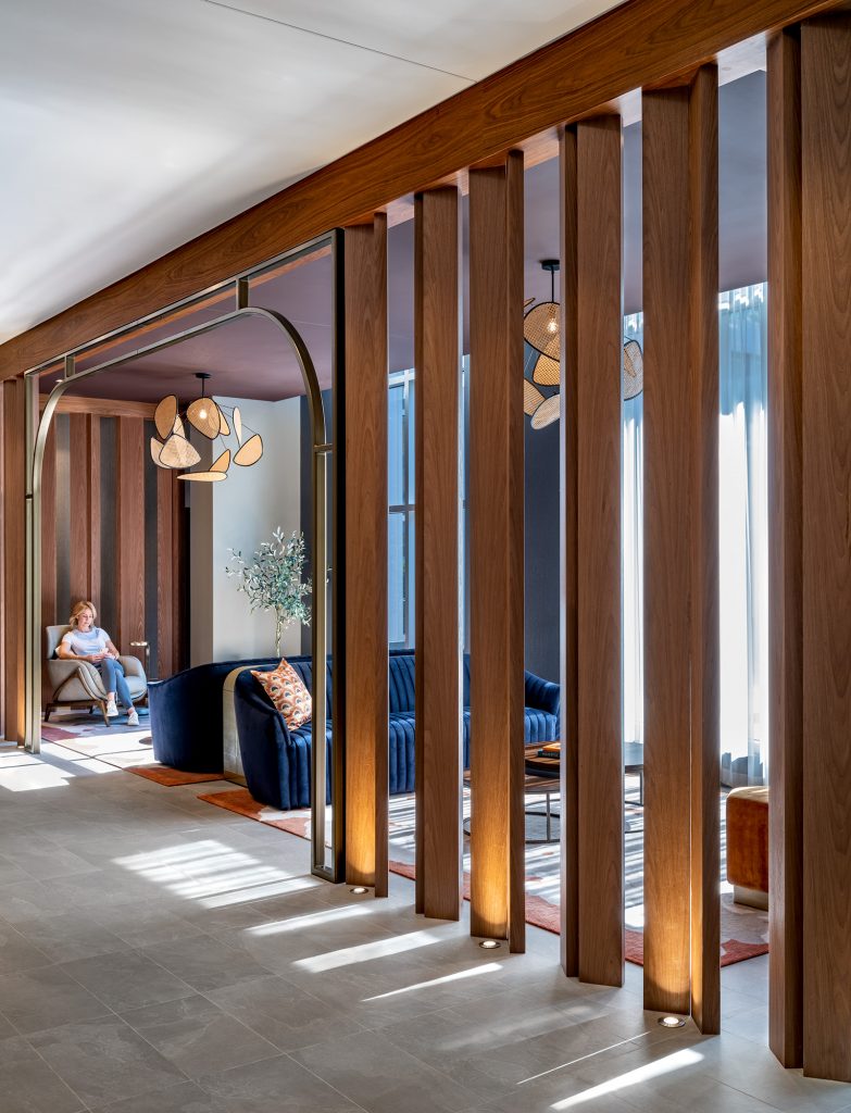In contrast to its entertainment-driven neighbor, Wind targets right-sizers with amenities for independent, quiet activities. Texture, natural materials, and imagery add depth to the Wind concept, including cloud paintings, windmill-inspired room partitions, hanging mobiles, and sculptural sand ripple wallpaper.
