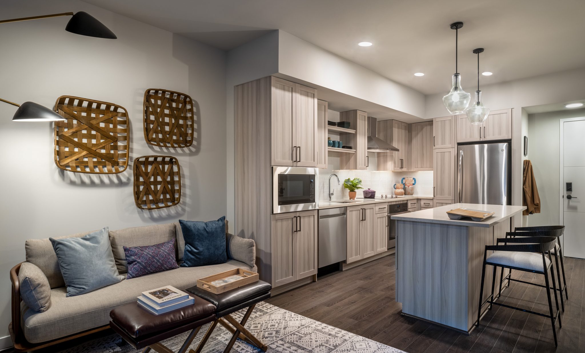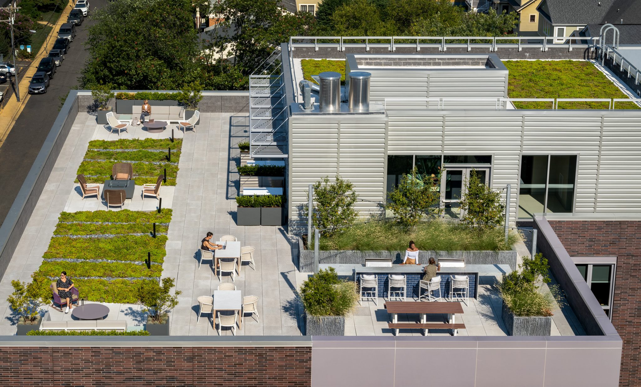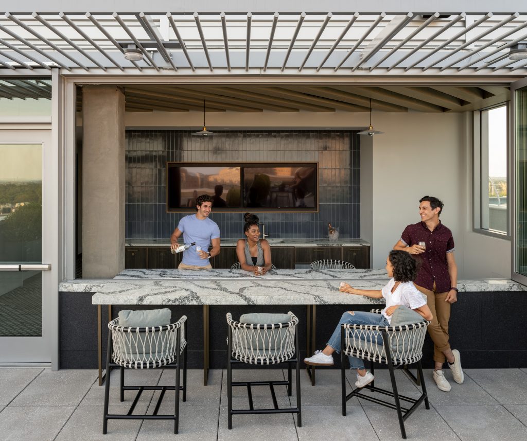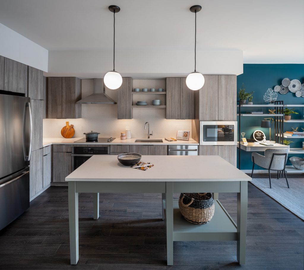 Luxury amenities distributed across the two buildings are shared among all residents, with a dedicated rooftop, mailroom, and naturally-lit fitness center in each. The development also provides co-working and conference spaces, complete with video-conferencing capabilities for today’s hybrid worker.
