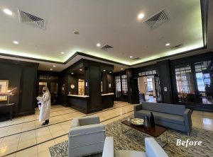 Inspired by the gracious gardens of English manor houses, the interiors now evoke a sense of tranquil luxury. Over 85% of the classically inspired millwork and trim were meticulously reclaimed and refinished, seamlessly integrating the heritage elements into a refreshed, contemporary design. The lobby palette and textures reflect the natural world, with soothing colors and verdant accent hues and organic materials creating a calming atmosphere.