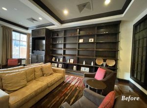 The former movie room was converted into a charming club room, designed for socialization and relaxation. This inviting space features an entertainment bar, a game area, and a cozy lounge, all arranged to encourage gathering and leisure. The warm, intimate ambiance makes it an ideal gathering spot for residents to enjoy together.