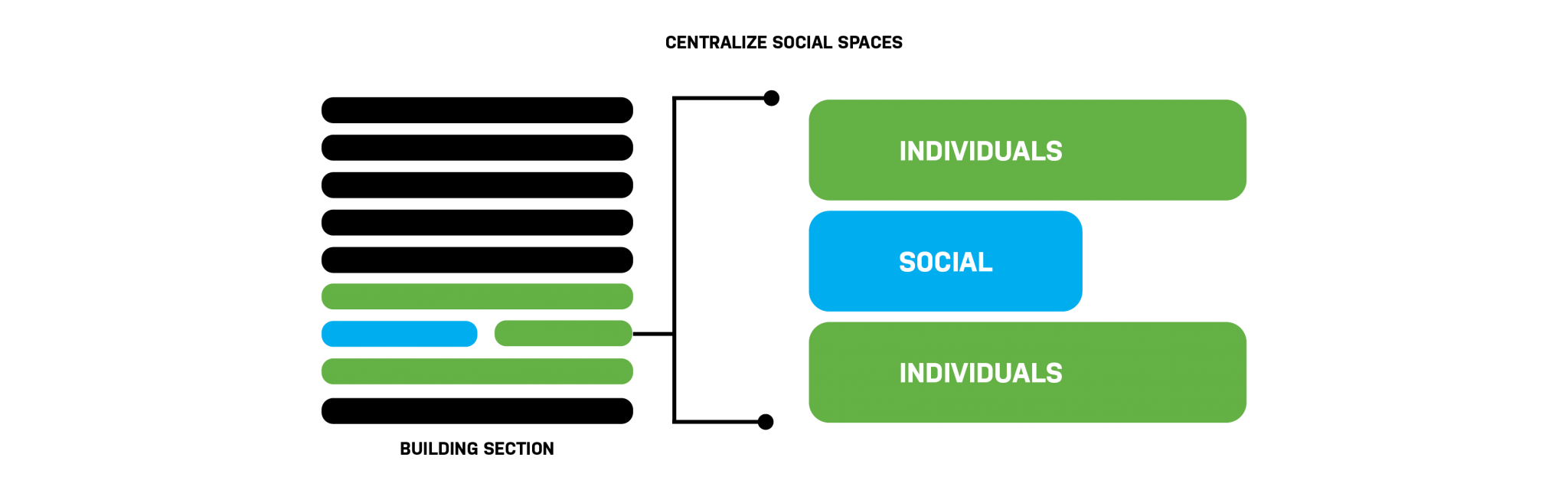 We continue to study the evolution of coworking and apply best practices from this exploration to our coworking operator clients, spec office building owners, and corporate clients, resulting in buildings designed to maximize productivity and inspiration by providing abundant spatial variety and collision opportunities.