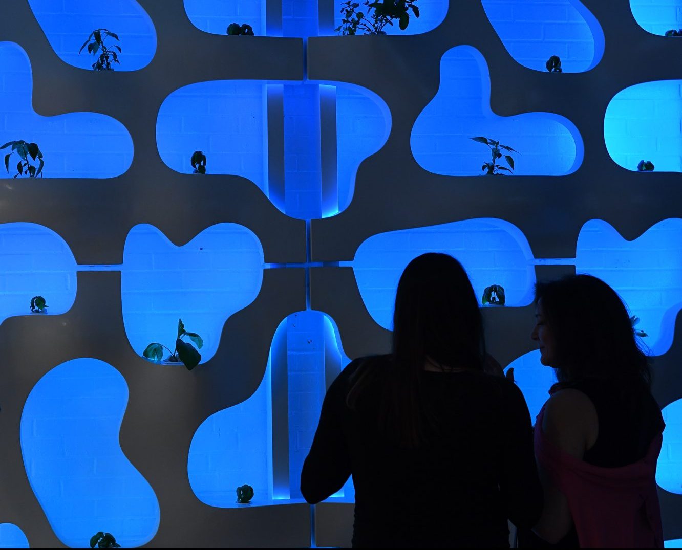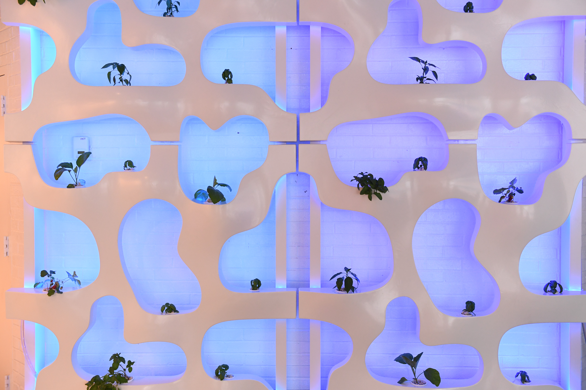 The hydroponic plants grow along with the season. To ensure plants receive enough light, HydroSkin incorporates contouring LED light strips at the perimeter of each plant container opening. This supplemental lighting assures an abundance of stocky green seeding, and enhances the building’s nighttime and cold season aesthetic. The lighting strips can be connected within an individual 5’x5’ module and from one module to another.