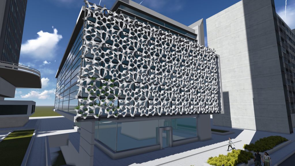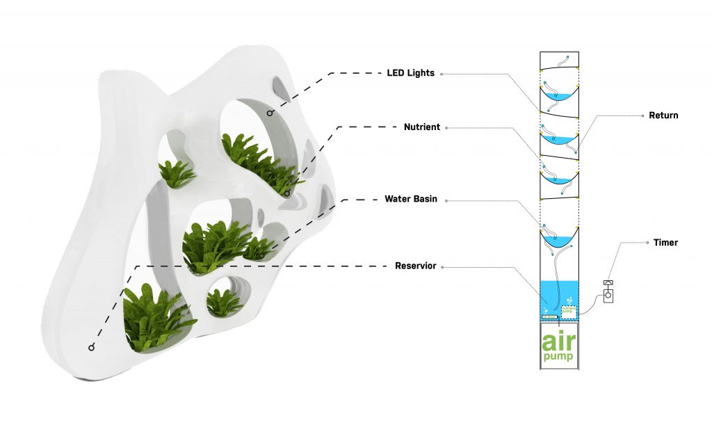 Research shows that modularity of form is paramount for future replication and a consistent aesthetic. Mounted to a grid attached to an existing façade, the form contains cell-like openings, each lined with a planter pot. These pots are interconnected through a network of feeder tubes within the form that lead back to a nutrient reservoir, providing sustenance while maintaining a clean aesthetic.