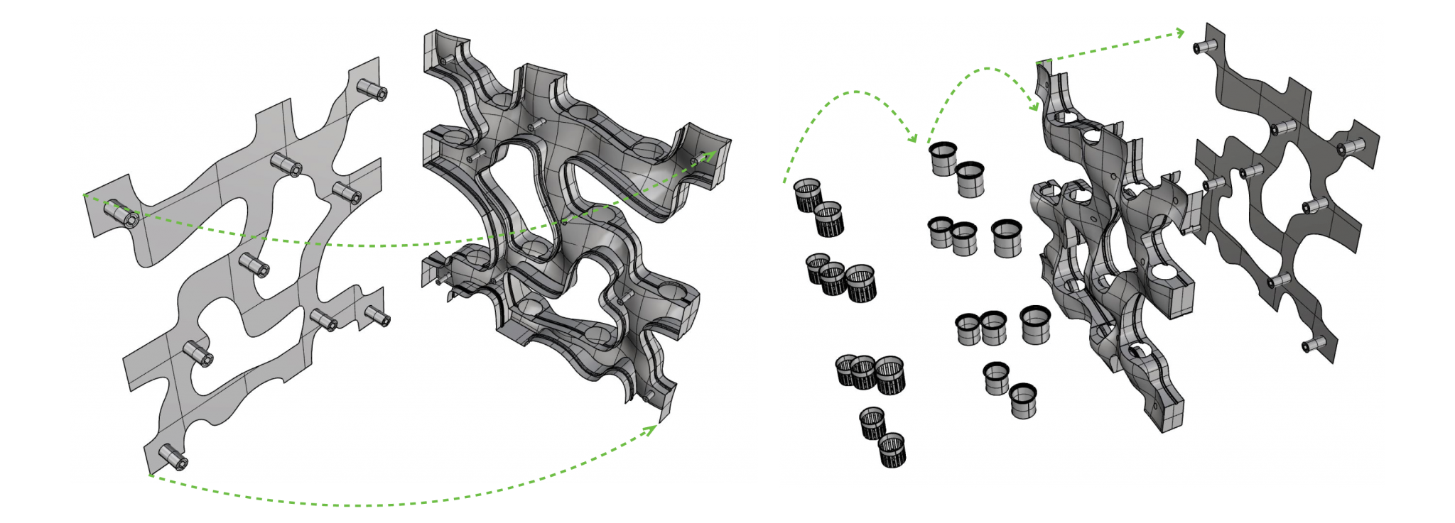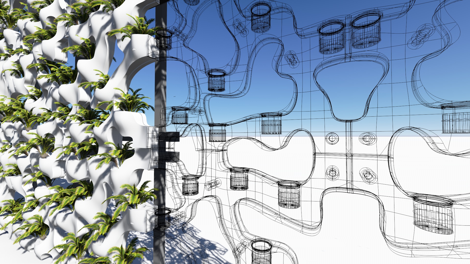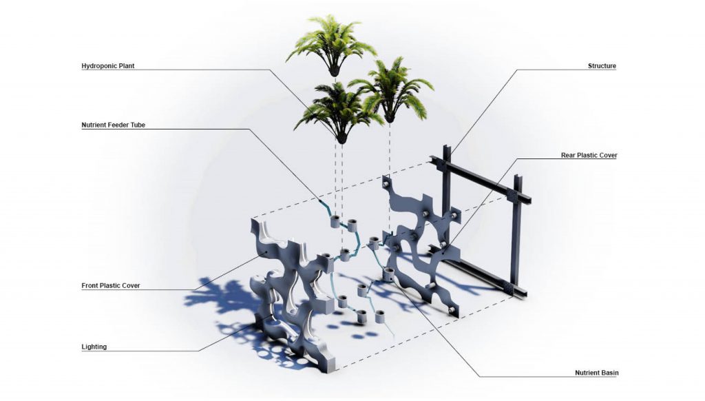 HydroSkin is designed as a system of connected modules to allow for convenience and flexibility in production. It consists of a flat back panel and a dynamic front panel, with electrical and hydroponic contents hidden between the two. The 5’x5’ module connects to adjacent panels at 8 separate nodes, with electrical and plumbing connections assembled vertically at the top and bottom of each. The dynamic design creates a sculptural form and prevents repetitiveness when used over large areas. Each module is prefabricated, with its supporting grid structure installed on-site.