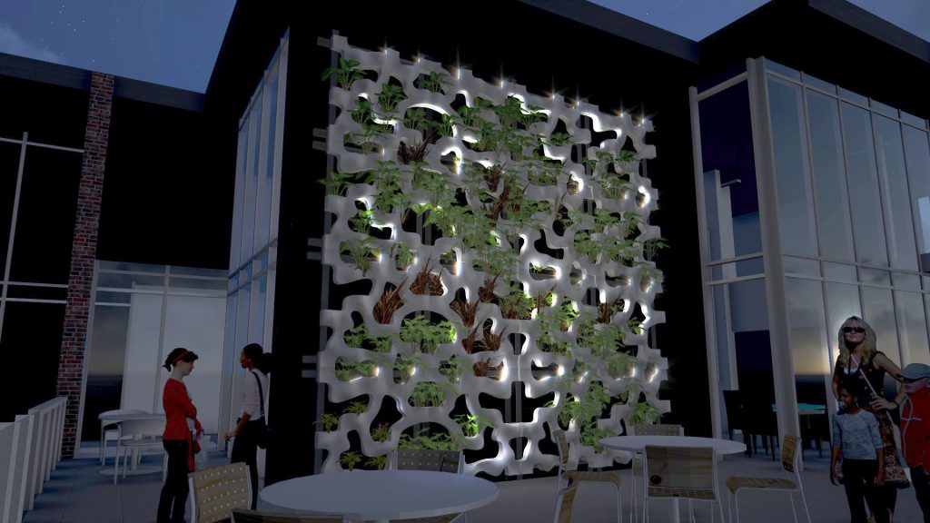 In 2015, the Hickok Cole HydroSkin team began working to prototype the design in partnership with Curtainwall Design Consulting (CDC) and Metalwërks USA. During the process, the team tested a variety of building materials, selecting aluminum for its ability to meet the design’s functionality and aesthetic specifications. Fabrication began at the beginning of 2017 in conjunction with thorough testing of the hydroponic and lighting systems to ensure they functioned efficiently. This testing incorporated a variety of herbs and lettuces to see how different plants responded to the system.