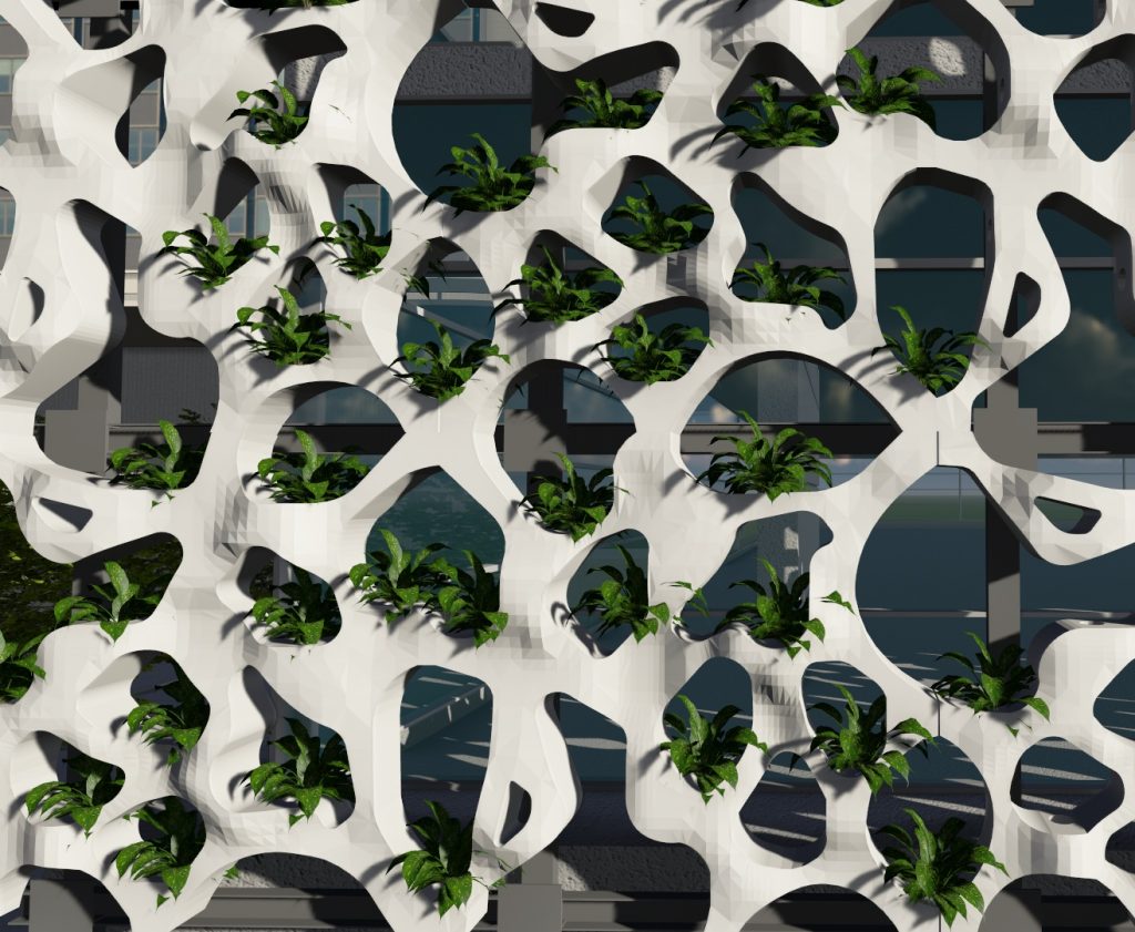 Research shows that modularity of form is paramount for future replication and a consistent aesthetic. Mounted to a grid attached to an existing façade, the form contains cell-like openings, each lined with a planter pot. These pots are interconnected through a network of feeder tubes within the form that lead back to a nutrient reservoir, providing sustenance while maintaining a clean aesthetic.